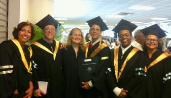 En una de las graduaciones de la PUCMM un grupo de académicos compartiendo entre colegas .
